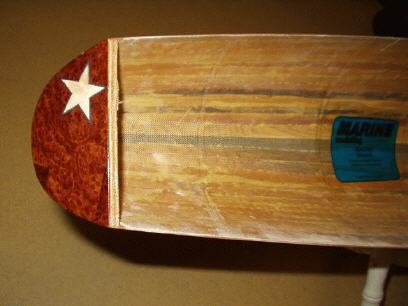 Auch hier wird die Matte zugeschnitten, der Rumpf mit Epoxidharz eingelassen, die Matte aufgelegt und von der Kielleiste her langsam angetupft.